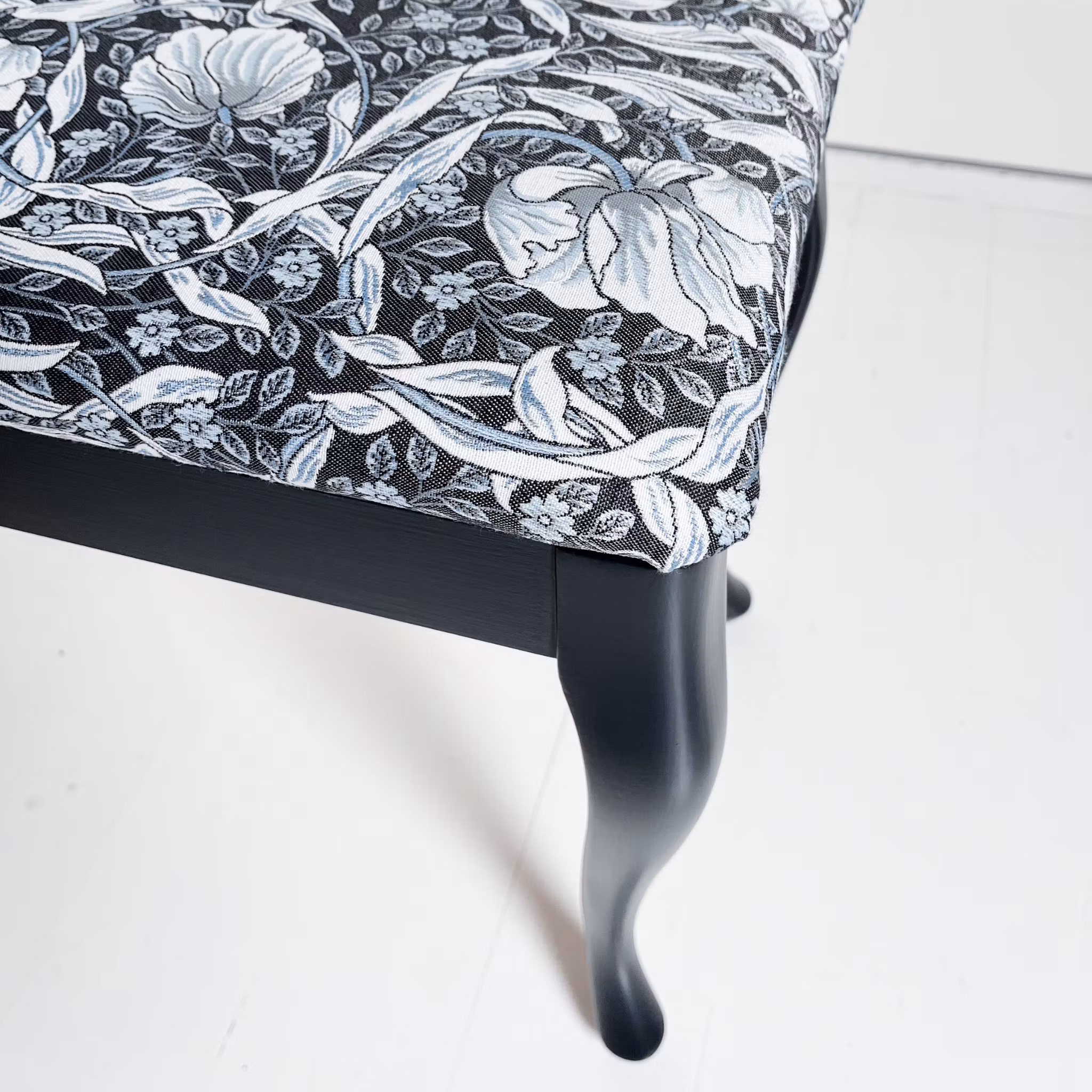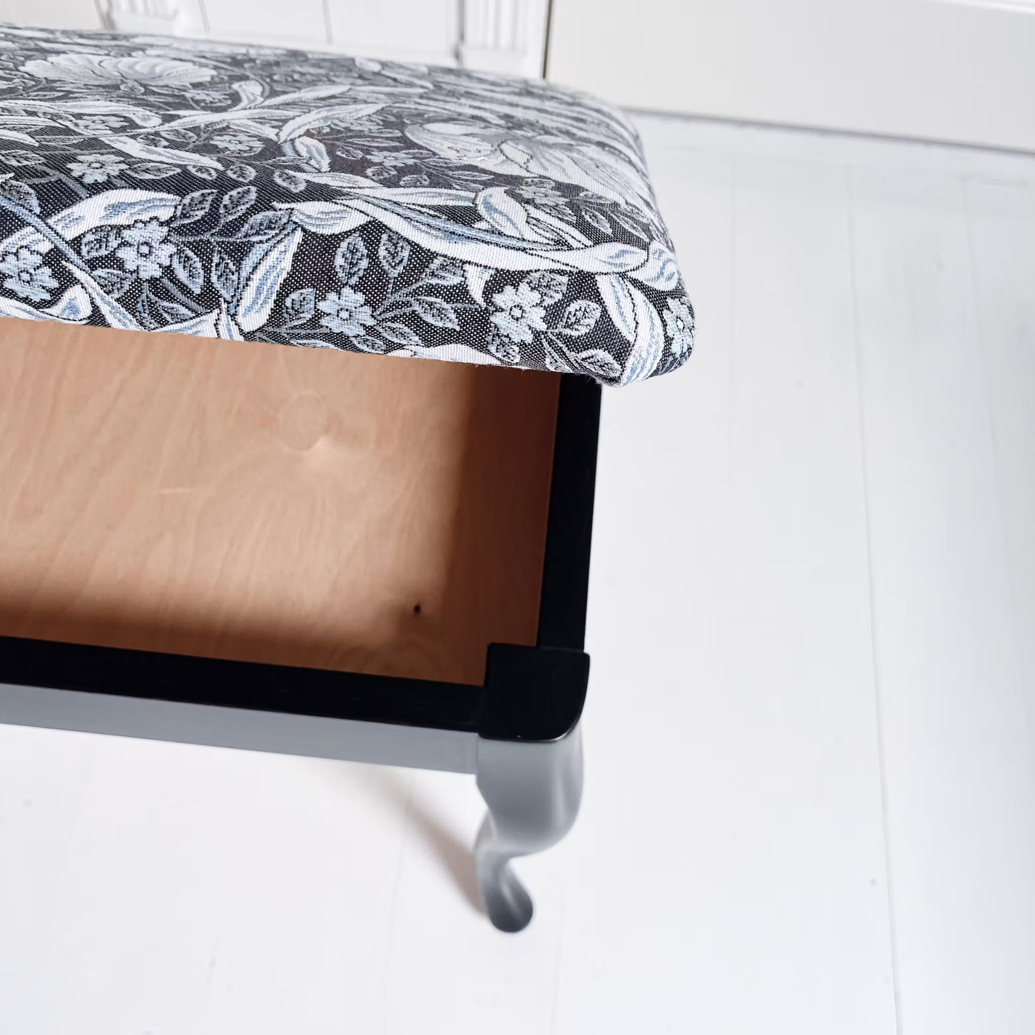 Sitsen har fått ny stoppning och är klädd i ett blåvitt tyg med stora blommor som lyfter den djupa blå kulören. Helheten ger pallen både karaktär och ett personligt uttryck.