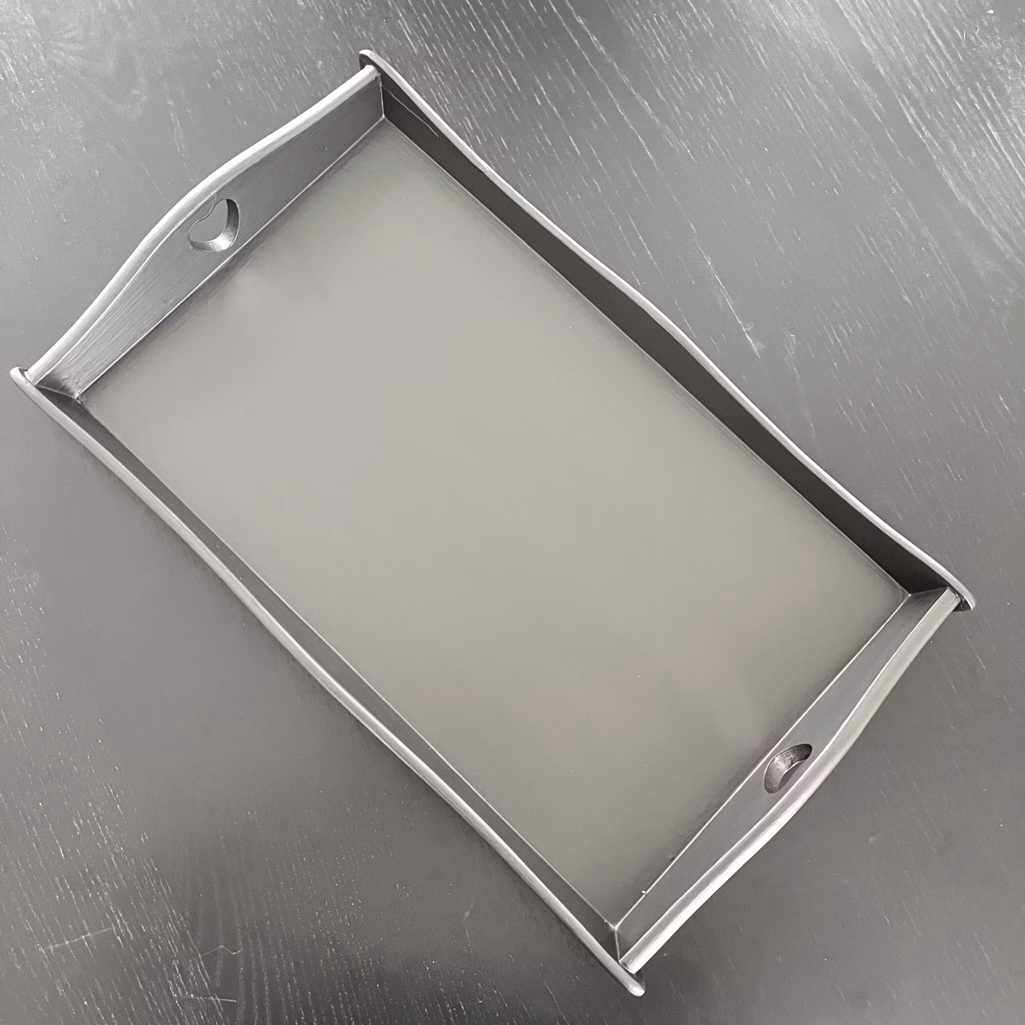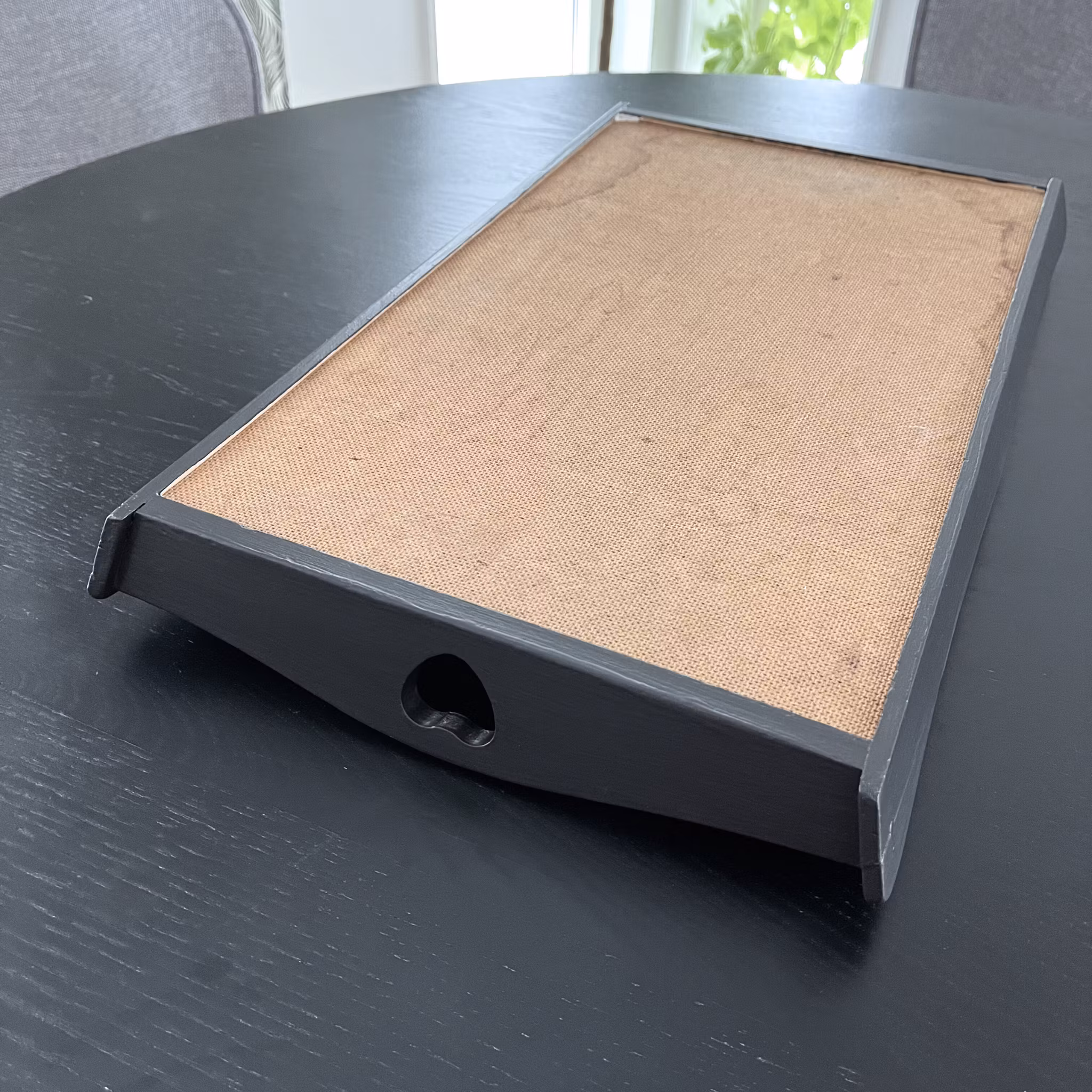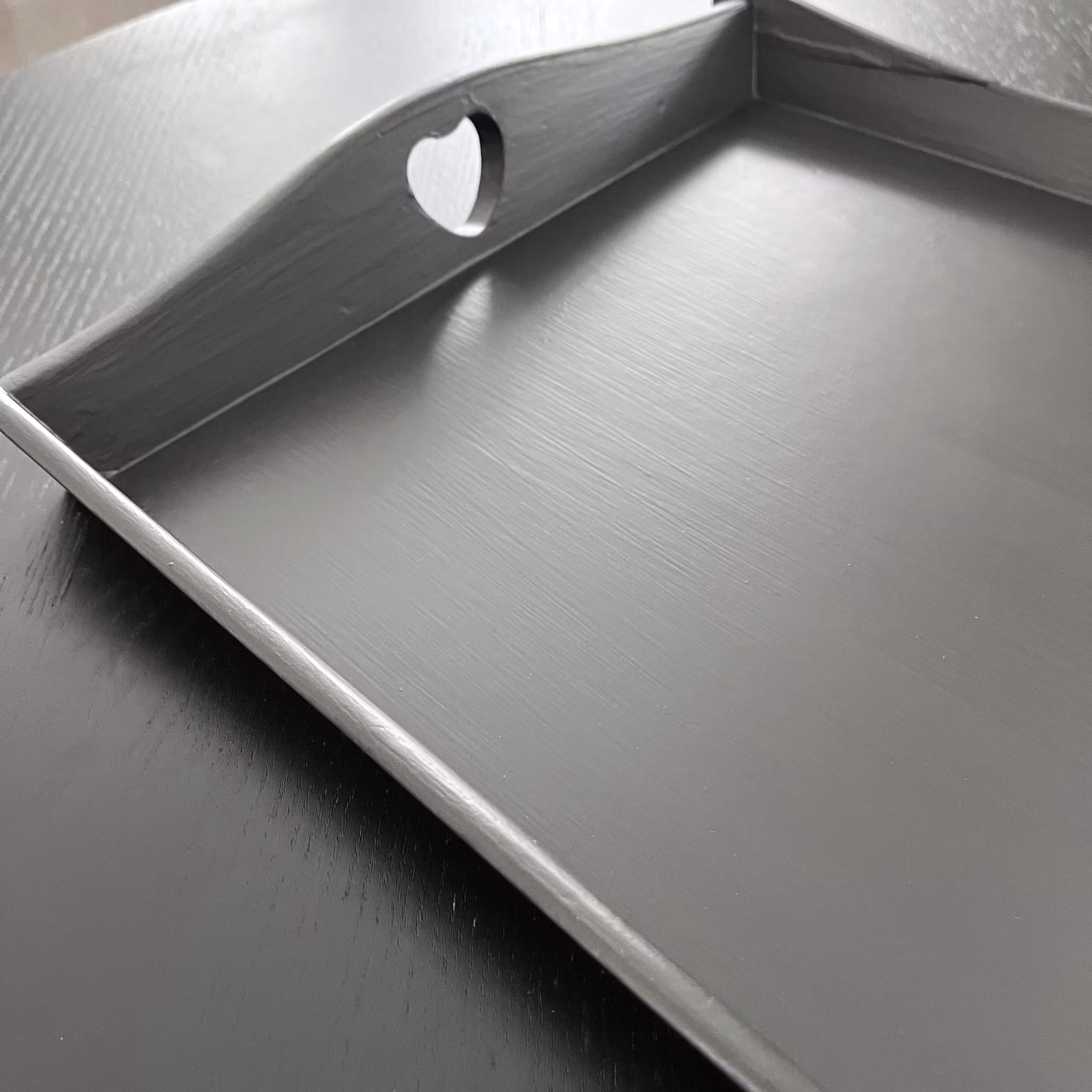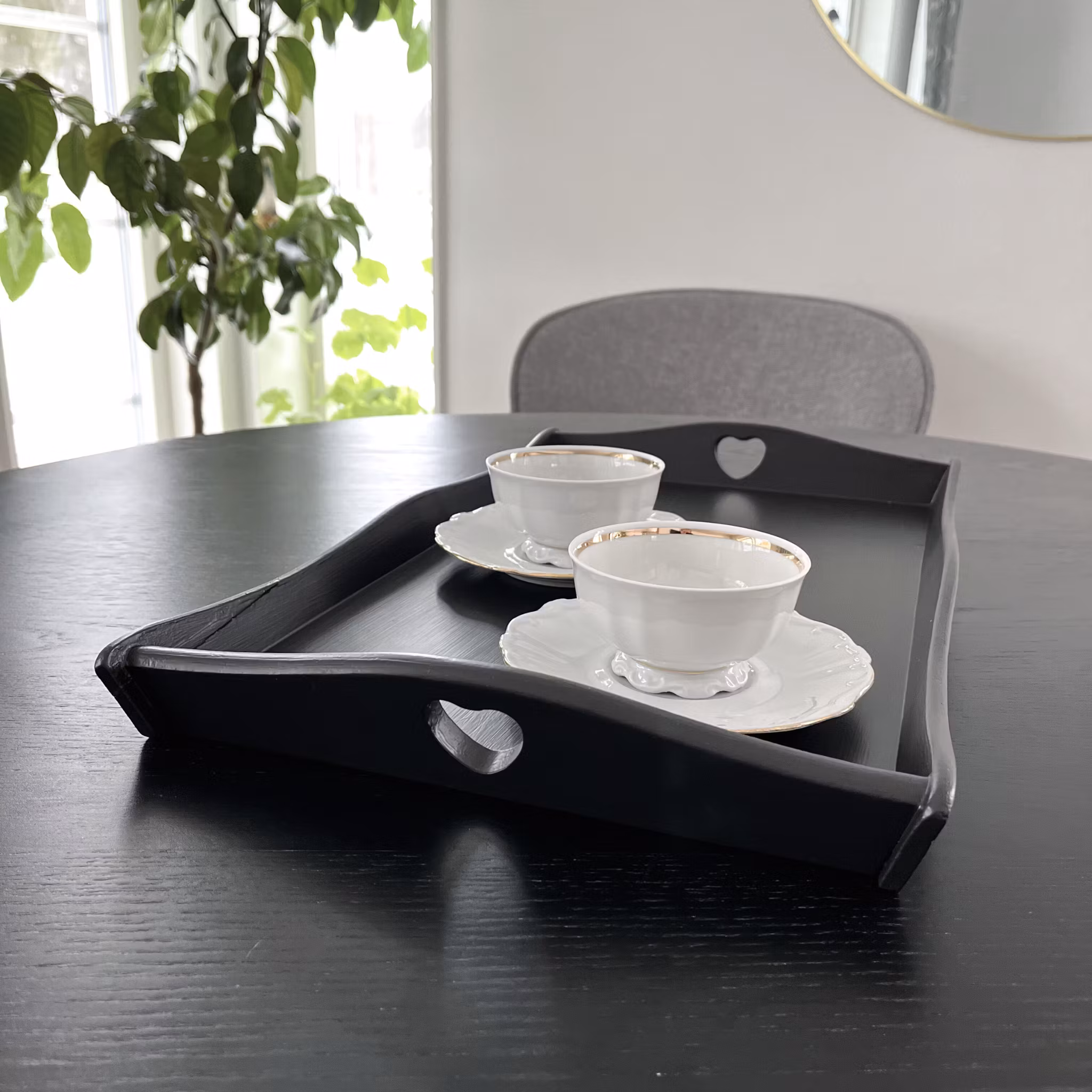 Dekorativ träbricka med handtag och utskurna hjärtan på kortsidorna. Brickan har målats om i en svart sidenmatt nyans som ger ett mjukt och stilrent uttryck.