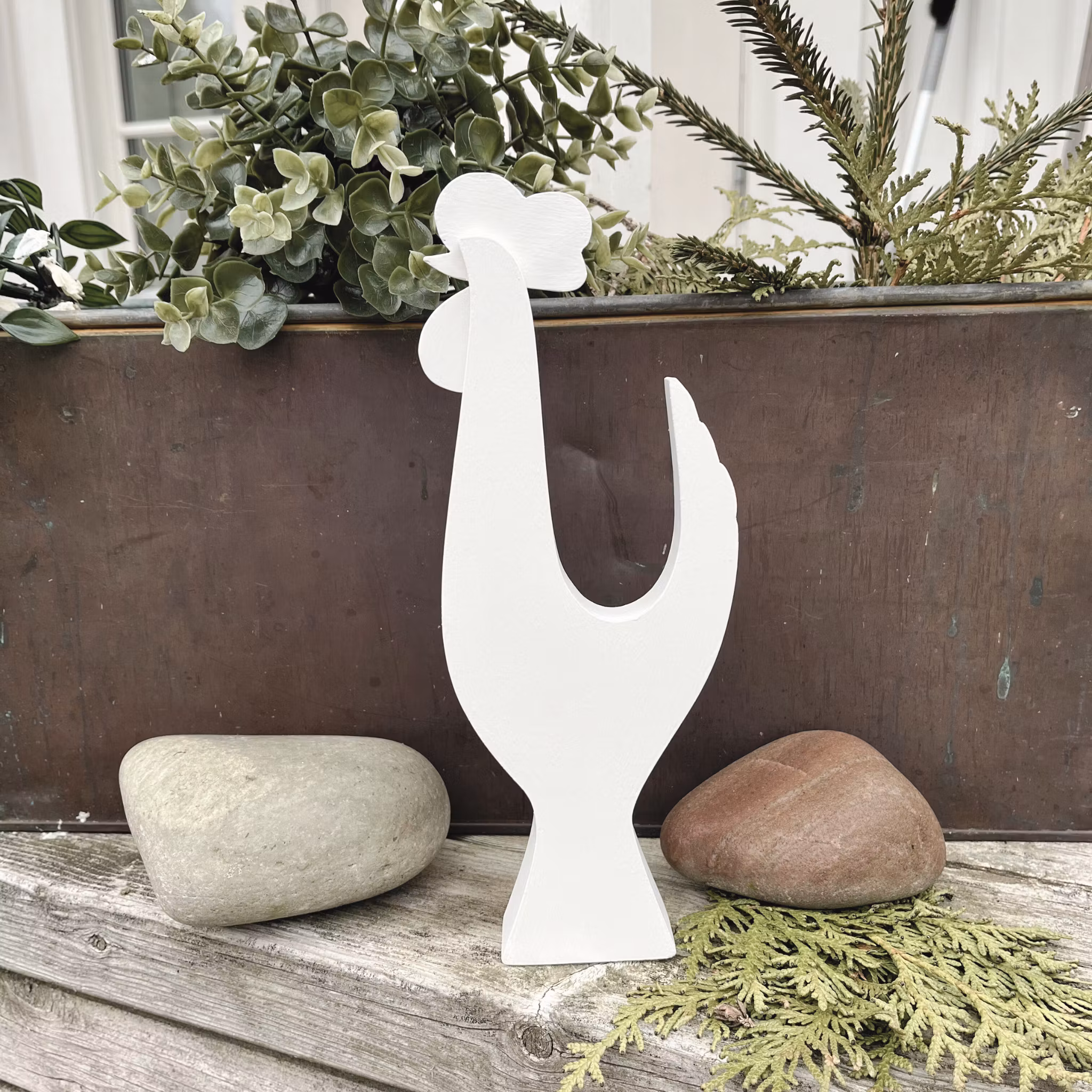 En charmig tupp i trä som har fått nytt liv med vit färg. Den passar fint som en liten detalj i köket, på en hylla eller som en del av en lantlig inredning.