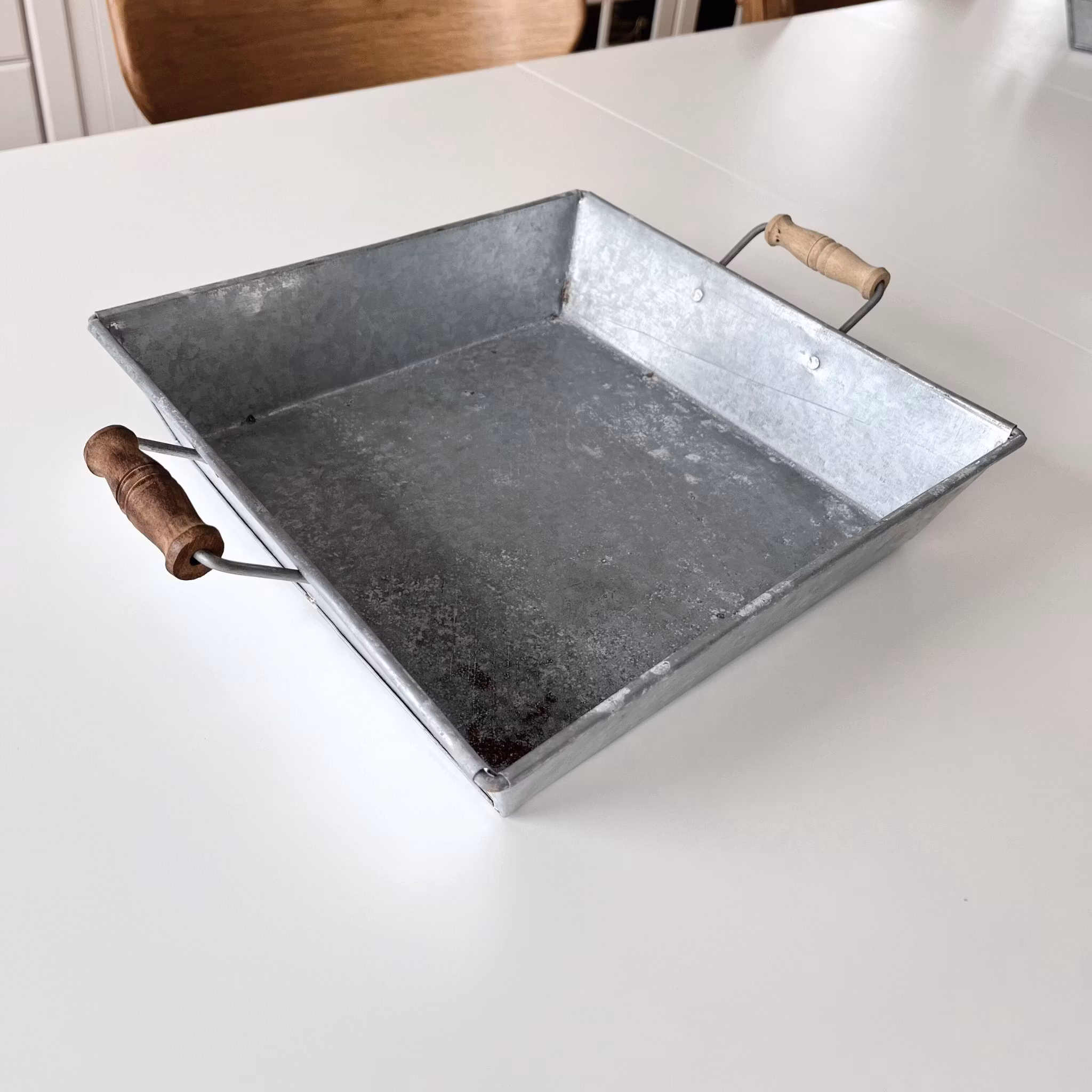 Stilren bricka i metall med handtag i trä. Det enkla och funktionella uttrycket gör brickan lätt att använda både till servering och som dekorativ detalj i hemmet. Passar lika bra för ljus, växter eller andra småföremål som för praktisk användning i vardagen.