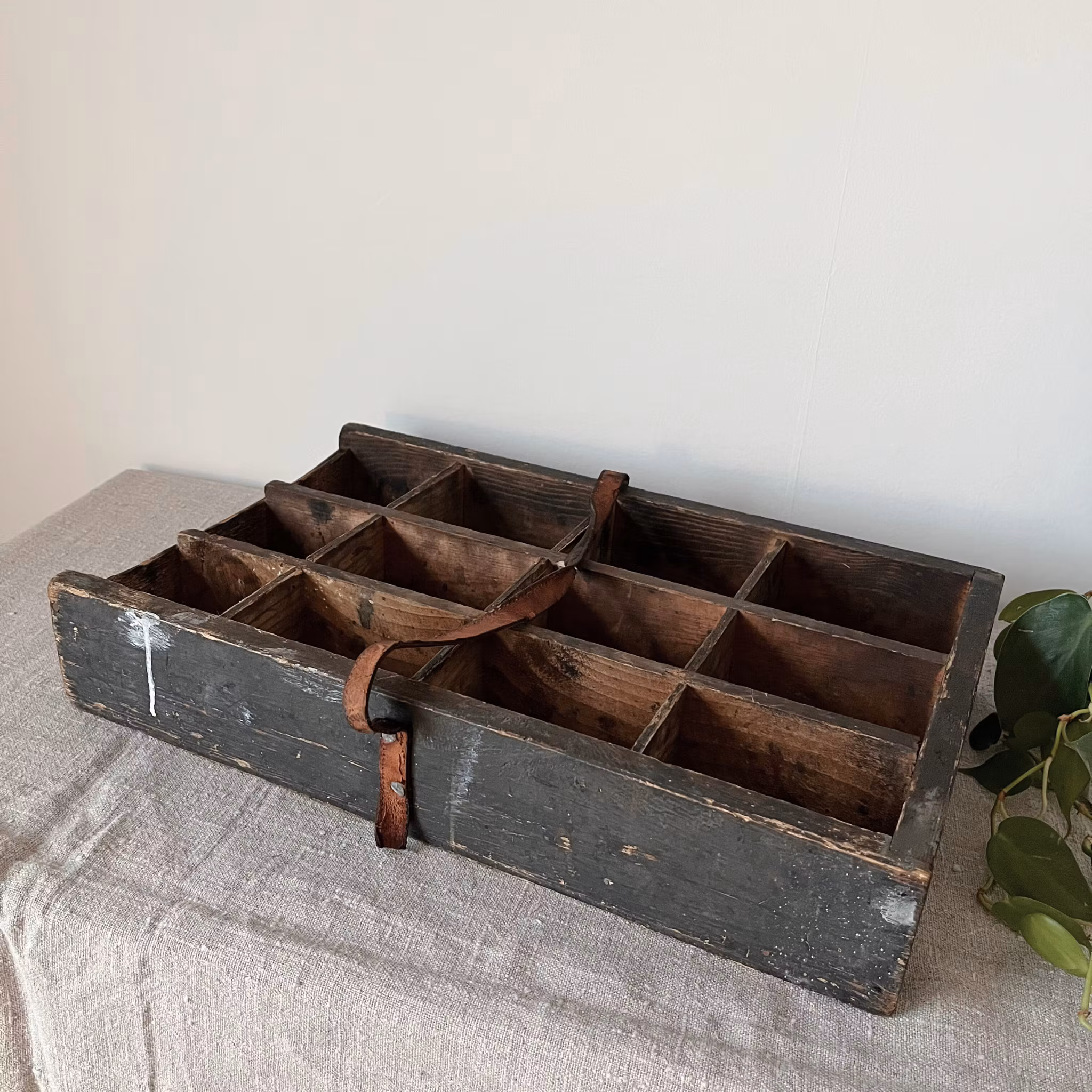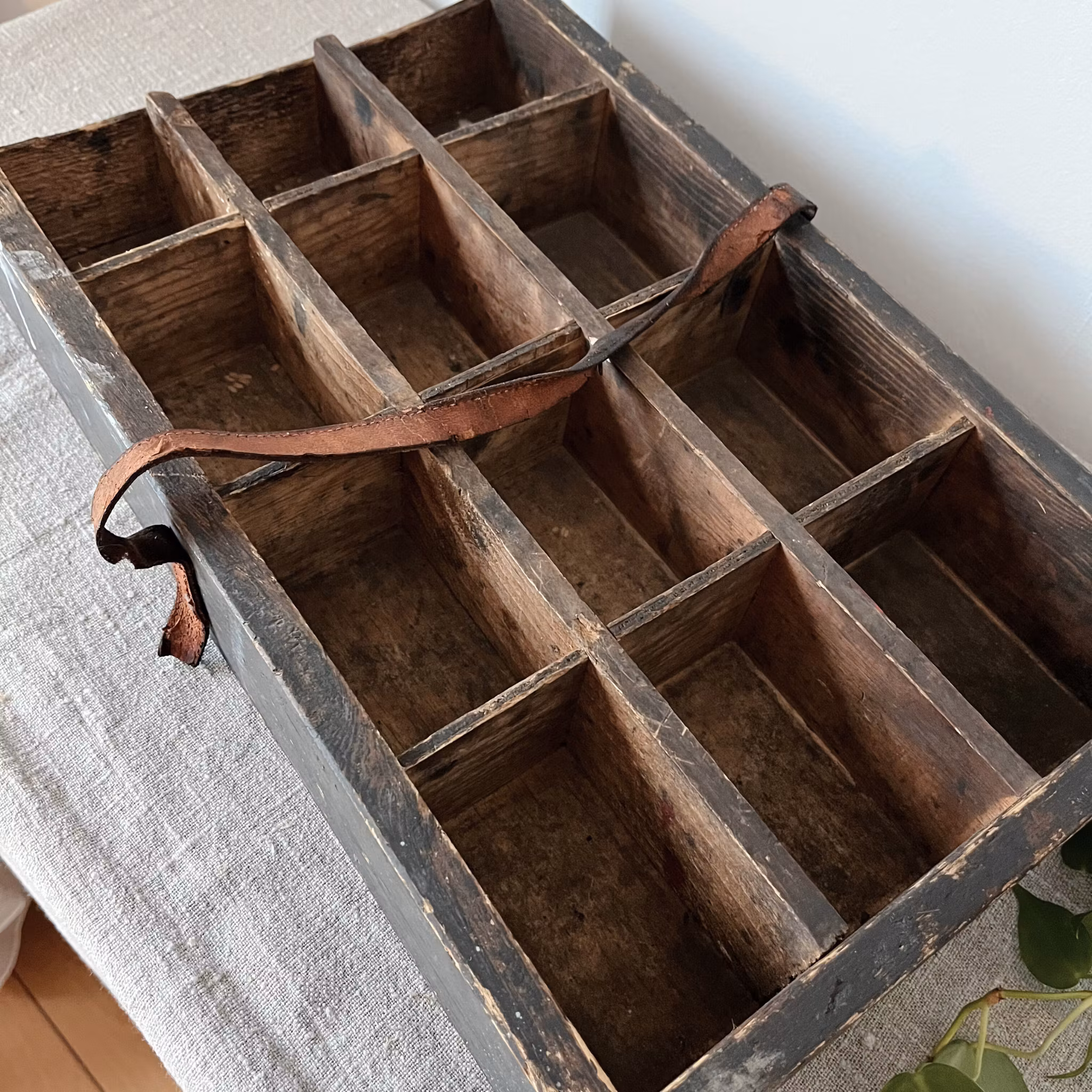 Vacker och välanvänd trälåda, troligtvis handsnickrad och ursprungligen använd som förvaring för spik eller småverktyg. Lådan har flera fack och bär tydliga spår av ett långt liv – slitage, märken och en trasig läderrem som en gång fungerat som handtag. Allt detta ger den en genuin, rustik karaktär.
